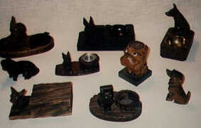 einem Bakelit-Aschenbecher sitzt, war eines der typischen Schnitzmotive. Aber